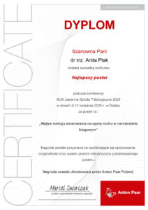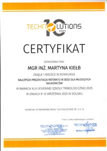 3 miejsce – mgr inż. Agnieszka Barszczewska (Politechnika Gdańska); wyróżnienie Polskiego Towarzystwa Tribologicznego